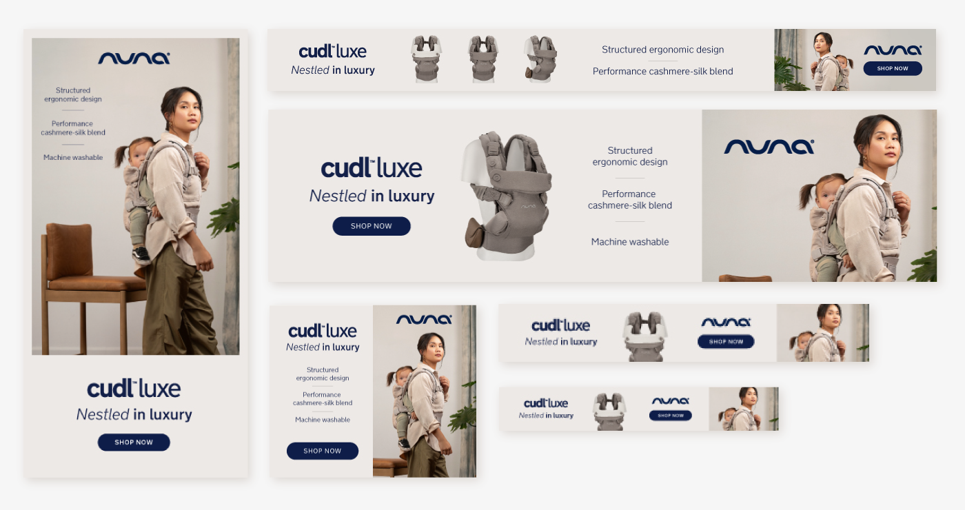 Nuna is a global baby gear brand known for its modern aesthetics, innovative design, and uncompromising safety. As a designer on the creative team, I developed visual assets across digital, print, and environmental media—ensuring cohesive brand storytelling across every touchpoint.